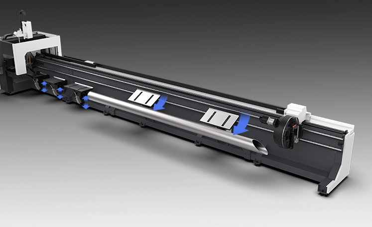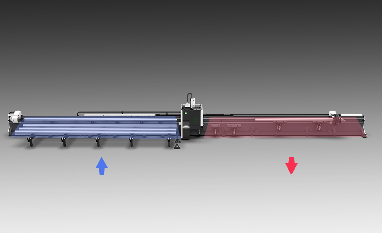 When full pipe processing is not required, the two-chuck mode can be switched. Blanking only uses the follow-up flap for material discharge, eliminating the material pulling time of the third chuck and maximizing processing efficiency.